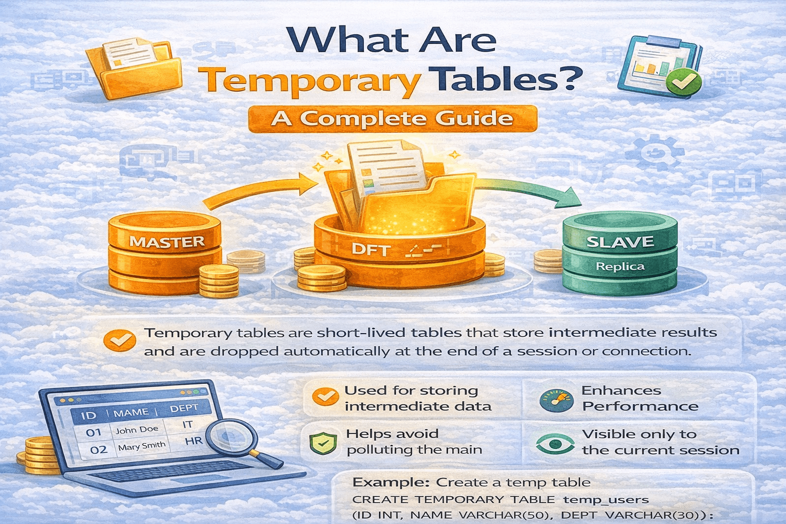 Temporary tables in MySQL are special tables that exist temporarily during a database session. They are useful for storing intermediate...