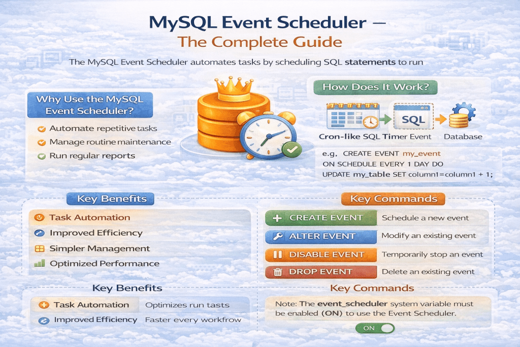 When working with databases, there are often situations where you need to automate repetitive tasks like cleaning up old records, generating daily reports, or archiving data. Instead of relying on external cron jobs or scripts, MySQL provides an in-built feature called the Event Scheduler to handle such automation.